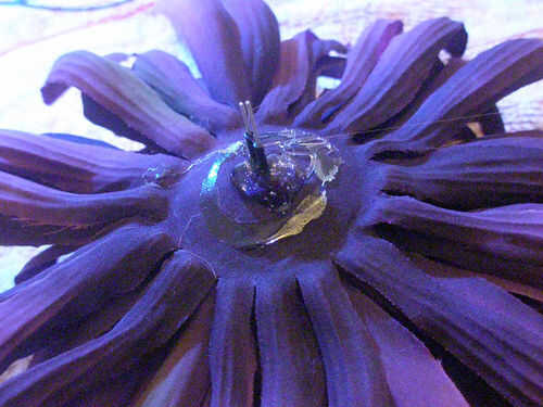Compruebe el LED para asegurarse de que funciona primero. Envuelva alguna cinta aislante alrededor de uno de los conductores y luego alrededor de ambos, pero no envolver demasiado apretado o ejercer presión sobre ellos. Esta es la parte que ahora actuará como la clavija de la Intro de la flor. Conecte los cables envueltos por los pétalos superiores y continuar poniendo la flor detrás junto, caliente pegado como vas. Mantenga las capas de pétalos en el mismo orden. Cuando termines, tu flor debe buscar el mismo como lo hizo antes, pero con un LED en el centro.