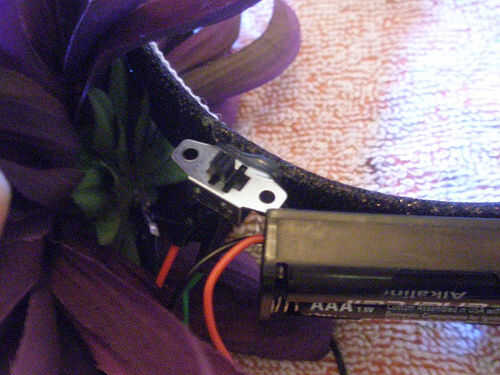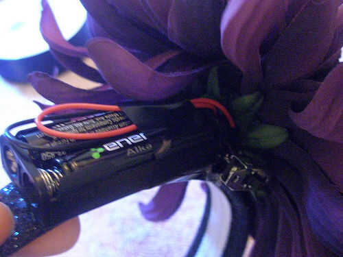 Usando la cinta, enróllelo alrededor de la batería entera por lo que se oculta. Tye un nudo y cortar la cinta o arco corto, sin embargo desea. Creo que la cinta queda bastante que cuelga abajo de la diadema. Puede ser que necesite pegar la cinta en algunos puntos, asegúrese de que puede desatar fácilmente para cambiar las pilas.