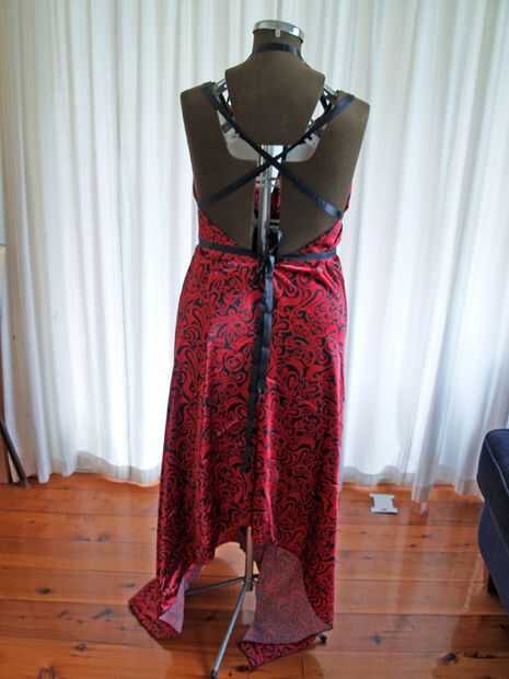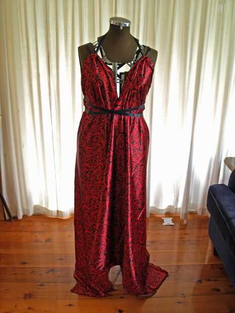 El vestido tiene un frente de abrigo abierta que se asegura con cinta. Puede ser envuelto y usado en varios estilos diferentes.