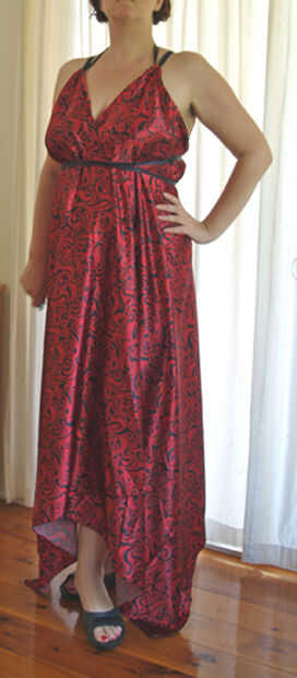 Se trata de una manera fácil de hacer un vestido de dos pañuelos grandes o de dos piezas iguales de tela. Yo he estado viendo vestidos de este estilo alrededor del lugar y cada vez que veo uno pienso "hey, eso debe ser sólo dos trozos de tela cosidos juntos... pero ¿cómo?..."