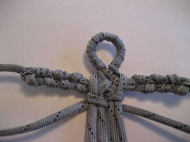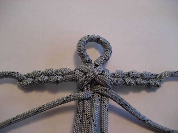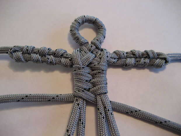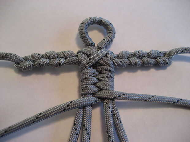 Enrolle el cable alrededor de las piernas les entretejiendo hasta 4 vueltas como se muestra. Agarra las piernas y apretar el tejido de cintura deslizando hacia la cabeza.