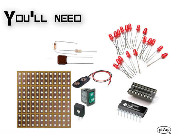 La resistencia variable preset se puede utilizar para ajustar la frecuencia del oscilador y determina la velocidad de destellos de los LEDs. El IC limita la corriente a y desde sus salidas para que los LEDs pueden conectarse forma segura sin resistencias en serie para limitar la corriente. La parte de la placa perforada del circuito es fácil de construir pero los cables de los LEDs necesita atención por lo que a continuación se proporcionan instrucciones detalladas.