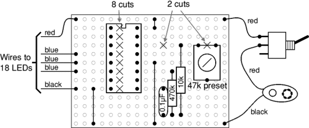 Construir el circuito 1) comience soldando los componentes sobre la placa perforada como se muestra en el diagrama anterior. En esta etapa, no inserte el CI 4060B.
