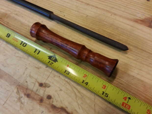 En general, se trata de un Instructable bastante simple. Empezar por decidir la longitud de la pieza principal y la varilla general. Mina terminó siendo alrededor de 15 pulgadas que es el tamaño más largo en promedio. Por desgracia, me olvidé de tomar una foto de la "hoja" te llamamos antes de que me volví pero fue sólo una pieza redonda de ébano. Me volví para que tuviera una agradable cuesta gradual con una punta puntiaguda que apenas se redondea. Entonces, usted necesita hacer el tope de la "hoja" alrededor de la mitad del diámetro de la manija pueden ser incrustado en el mango. Una vez obtienes lo que quieres en su movimiento de "hoja" en el mango. Voy a ser sincero que no tenía ni idea de como se verá mi mango cuando fui. Sólo sabía que quería ser simple pero elegante. Creo que tengo eso