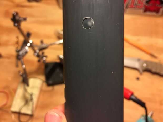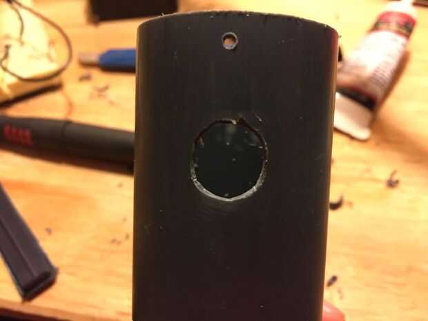 3. Perfore un agujero para el botón. Yo prefiero minas en la parte posterior de la empuñadura cerca de la cima. Comienzan con una broca pequeña y luego subir en tamaño poco a poco hasta llegar a un agujero lo suficientemente grande para el botón.