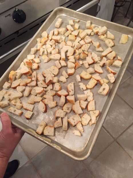 Derretir dos cucharadas de mantequilla con un microondas o una sartén en la estufa y luego vierta mantequilla en galletas y colocar los cubos de pan uniformemente en la hoja. Hornear a 350 por 15 minutos o hasta que estén doradas. Mantener control y usted también puede voltear. (Agregue sal si lo desea).