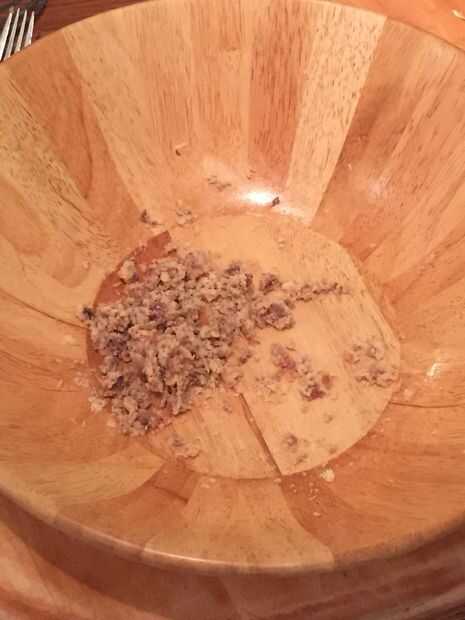 Utilizar trituradora de masa o tenedor hasta que la textura es la de formar una pasta homogénea (si no es perfecto, el aceite y el huevo que añaden más tarde ayudaría).