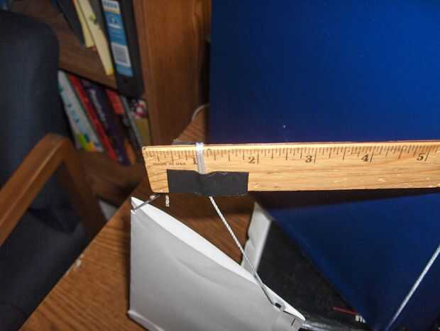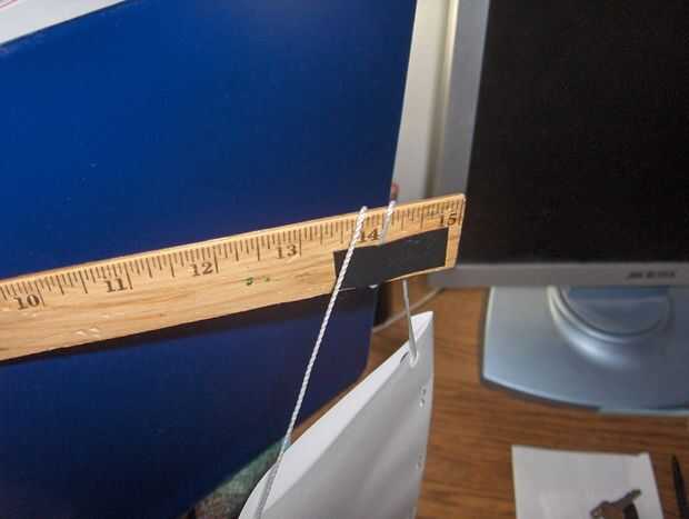 Lazo y colgar ambos "bandejas" en el otro extremo de la regla. Asegúrese de que están a igual distancia.