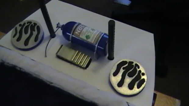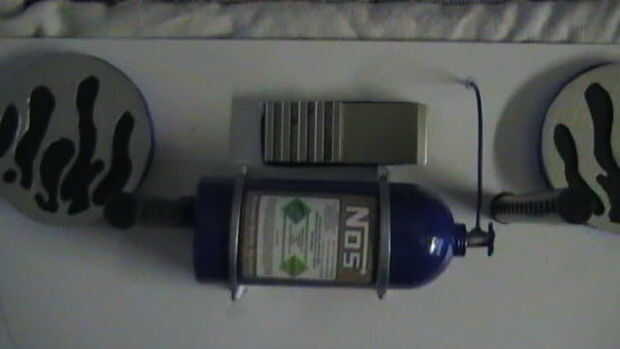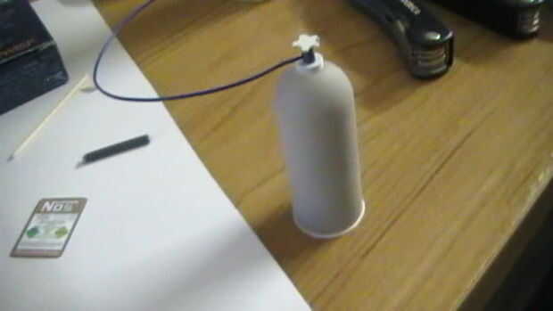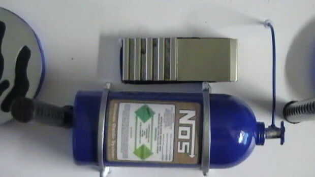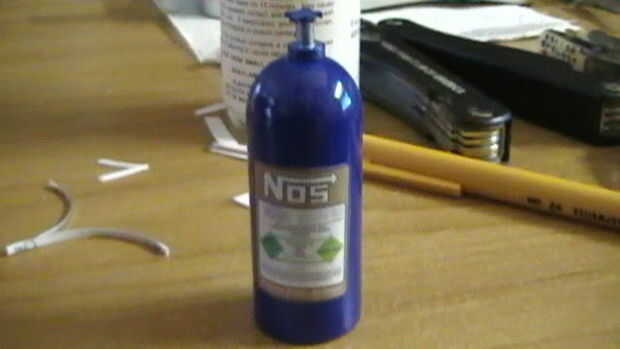 La botella no se usa desde la parte inferior del soporte de bolas de pintura. Solo lo corte a la longitud que necesita y añade un casquillo pequeño del estireno a final abierto. Voltee la botella de NOS y agregar algunos pequeños círculos de estireno que cortar o utilizar una perforadora para obtener. Unir todas las piezas y luego pintar. Agregue una etiqueta y algún alambre de calibre pequeño para una manguera y listo!