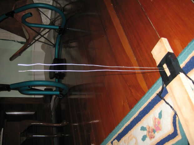 3. consigue dos lenths igual del alambre de acero. Curva en la parte inferior así que el pedazo de alambre doblado debe ser de 90 grados a la vertical broca. Utilizando palo de cinta aislante los dos pedacitos de alambre a la base.