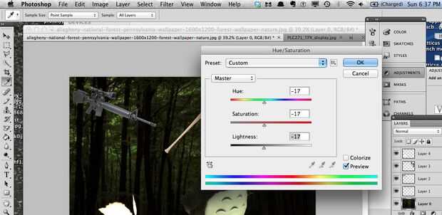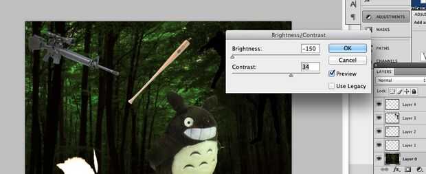 Puede hacer el fondo espeluznante en un número de maneras diferentes. Seleccione la capa de fondo. Ir a imagen/ajustes/tono y saturación y ponga el brillo hacia abajo. El fondo debe ser muy oscuro para el efecto final al trabajo. También se puede engañar con imagen/ajustes/brillo y contraste para lograr el efecto deseado.