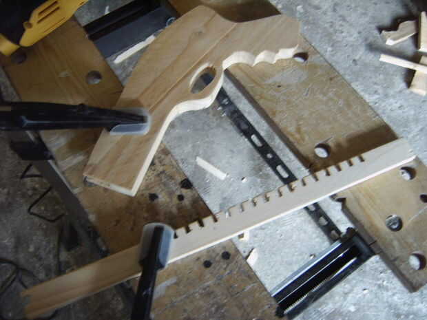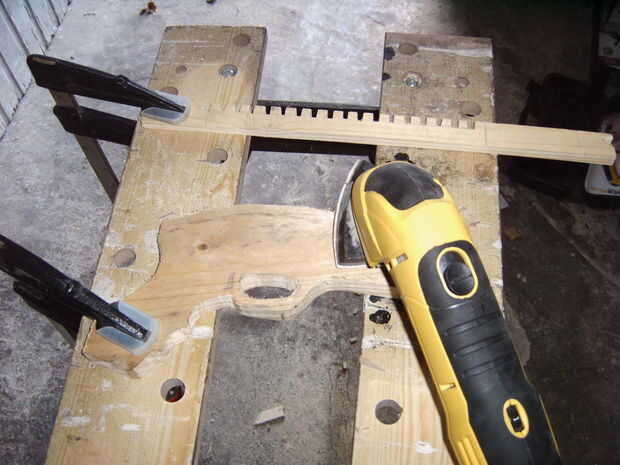 Luego su arma de la abrazadera en el tornillo de banco y la parte superior e inferior de la arena. Usted querrá pasó algún tiempo en la empuñadura de su arma. Sobre todo las curvas de su puño deben recibir mucha atención. Usted probablemente no recorto realmente bueno con la sierra caladora (herramienta) así que aquí está tu oportunidad de hacerlos muy bien formado y lisa.