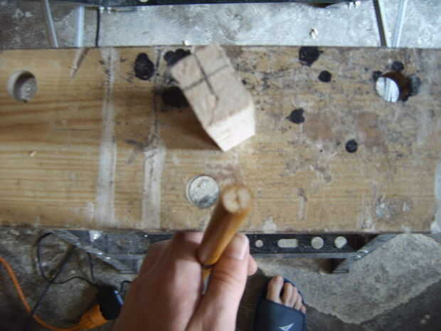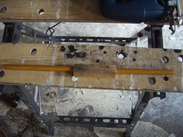 Luego cortar esta utilizando su herramienta eléctrica de jigsaw. Se trata de su culata. Ahora tienes que hacer un agujero en ella por lo que puede deslizarse fácilmente hacia abajo de la barra. Utilice una broca con diámetro de 1 cm/0,39 pulgadas y perfore un agujero a través de la madera miden 1,5 cm / 0,59 pulgadas desde la parte inferior.