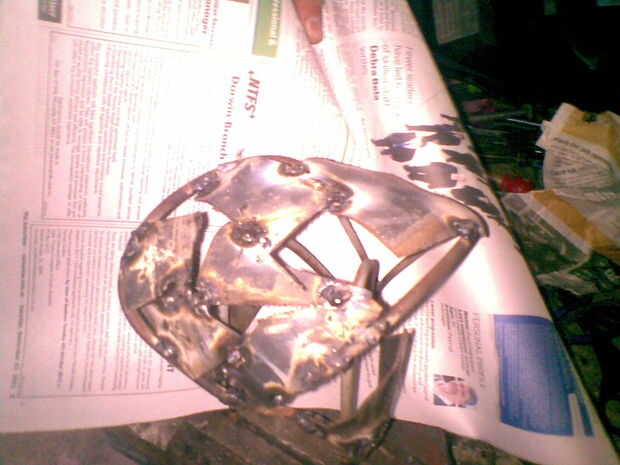Esta parte usted tiene que utilizar pequeñas piezas de acero para soldar con autógena el cuerpo principal, esto construirá la estructura y le dan su forma general. Quizás tenga que cortar las piezas de formas especial y dóblelos en "paneles". Esto puede hacerse por golpearse con ellos mientras que en un tornillo con un martillo de pein de la bola o el uso de una carretilla. Lo siguiente es soldar en pedazos aún más pequeños; Estos pueden ser acero de desecho al azar como llaves de tuercas, pernos, tuercas, tornillos, tubos, malla y varilla. Esto le dará un efecto mucho mejor porque no hay repetición.