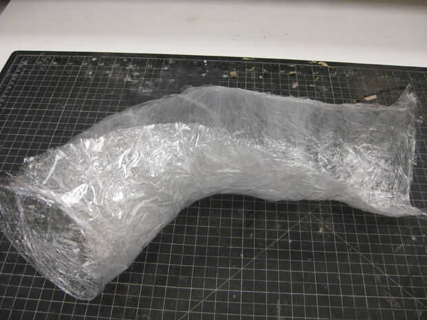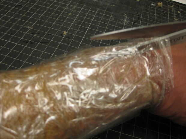 Cortador de cinta de uso hacer cuidadosamente un corte a través el molde por lo que puede liberar parte de su cuerpo envuelto.