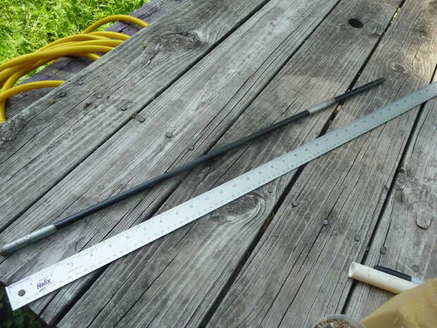 Una vez que te decides por la longitud total, usted querrá hacer su base de fibra de vidrio de 4" menos que eso, para el acolchado adicional en la punta. La persona que estoy haciendo esto para tiene una pierna que es cerca de 34" de largo, por lo que será la base que quiero un hasta 30". Eso significa a poco más 1 sección del poste de la tienda y les pegar. Utilice la sierra para metales para cortar y no presione demasiado duro para evitar astilladuras. Los extremos deben encajar muy bien en la Unión metálica, pero si las 2 partes del meneo, añadir una pizca de arena alrededor de la parte que se está insertando.