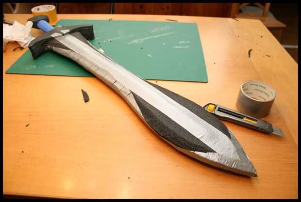 Add strips of duct tape to the sword. Tenga cuidado al aplicar la cinta especial alrededor de las esquinas. Tomar el cuchillo de la manía y corte la cinta en tiras para que no se llegar arrugada. Al aplicar una tira nueva de cinta, no haga que la superposición de más de 1 cm. Si pones mucha cinta, el arma se pone duro y pesado, lo que es peligroso jugar con.