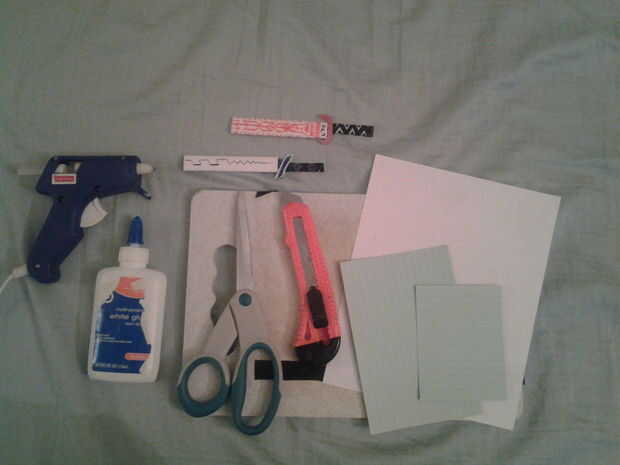 Materiales: 1 papel de la impresora 2 fichas de 6 x 4 Tijeras X-acto cuchillo o navaja de afeitar Tablero de corte pequeña Regla Pistola de pegamento caliente Pegamento blanco Opcional: Cinta para ductos Papel de aluminio
