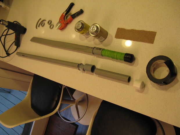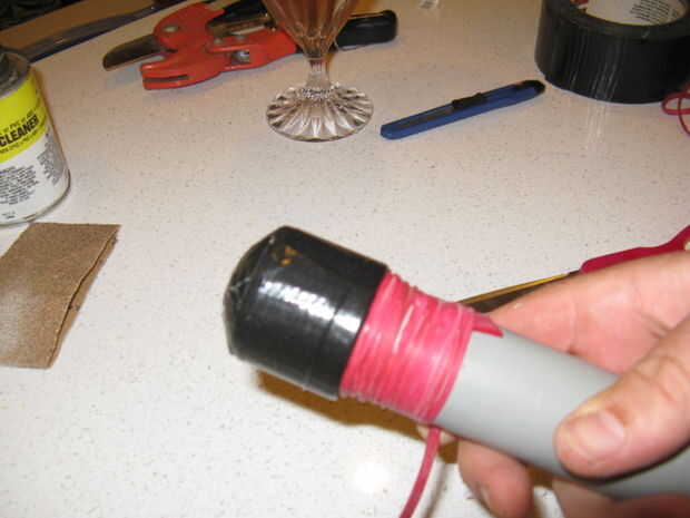 Cortar una banda de caucho y empezar a enrollar sobre la manija. Cuando llegué a la final de la banda, atado a otro a él y me mantiene la bobina, la bobina sobre los extremos atados y nudo. Repetir hasta llegar al otro lado y atar la venda. El mango entero fue herido bastante bien, así que metido el extremo suelto en un par de vueltas para sujetar firmemente.