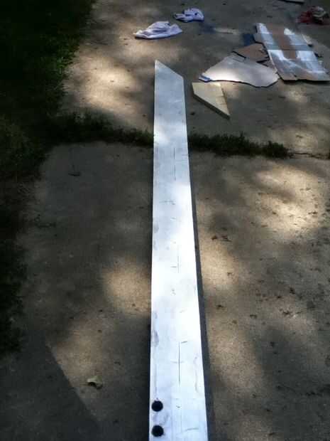 se trata de cómo hacer una espada muy simple en un día si tienes todos los materiales. Este es mi primer instructable y he trabajado duro para hacerlo. Así que por favor no me critique. Leer el conjunto de direcciones antes de comenzar. mi espada tenía una hoja que fue de 82 pulgadas de alto, una empuñadura de 1 1/2 pulgadas y un mango de 11 pulgadas. Así que en total mi espada era 7 pies de 10 1/2 pulgadas de alto pero puede ser más corto para un disfraz de Halloween o algo (en realidad se recomienda que sea en cualquier lugar de 3 a 6 pies). Poner sugerencias en los comentarios y por favor esto da un cinco estrellas.