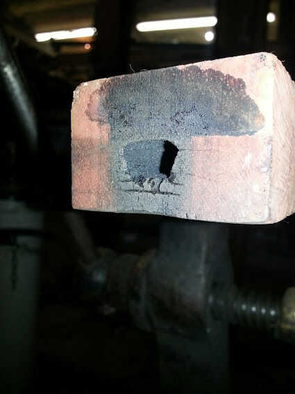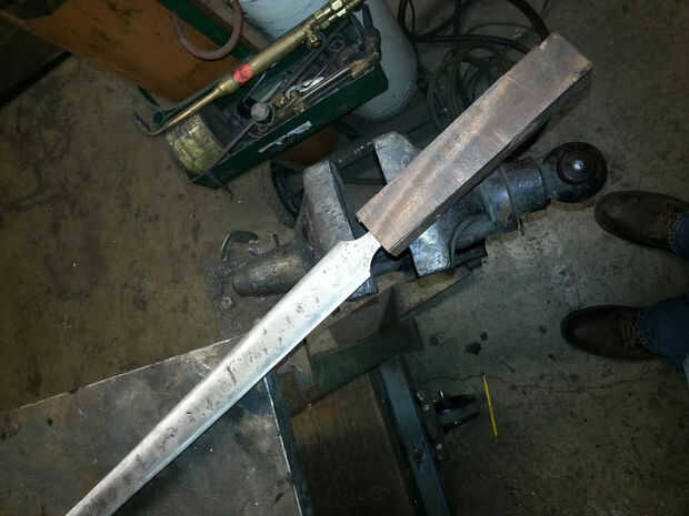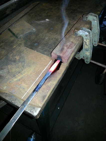 El siguiente es el mango de madera. El mango debe tener un agujero para la espiga que pasar por. Esto se hace generalmente con perforación y quema. Los conjuntos de perforación un todo recto para el tang y hace menos material debe ser quemado. Entonces se construye una falsa espiga para quemar un tamaño similar, pero más pequeño/ish. Después de que esté limpio, cualquier exceso espacio se llenará con epoxy cuando se pega. Ahora para mi proceso exacto.