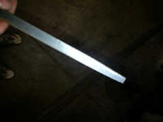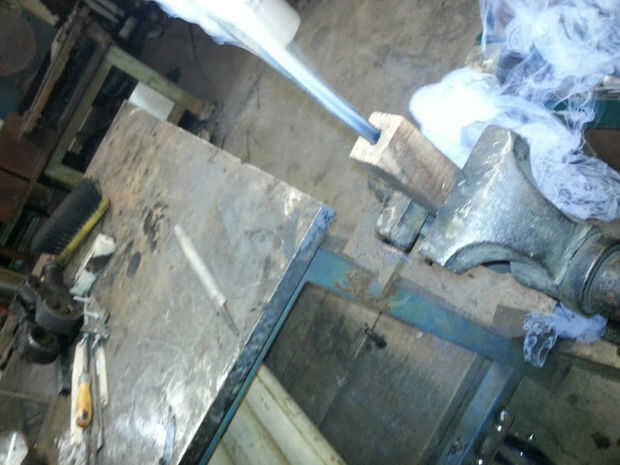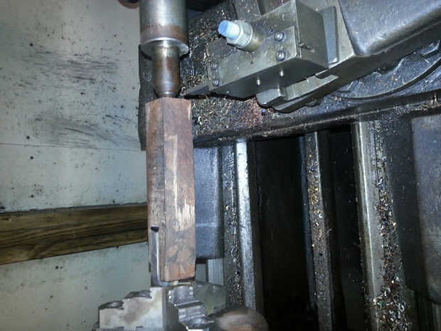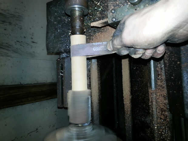 Con el agujero perforado fui a la amoladora y limpiar todos los rincones, redondeo de la pieza. Con lo más cilíndrico, es ponerlo en un torno y comenzó a dar forma a la pieza. Después de que lo tenía de tamaño hacia abajo, utilicé papel de lija en el torno. Con el mango terminado, me v