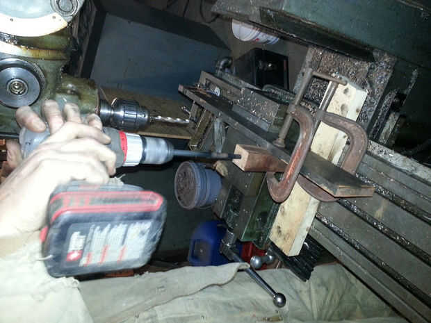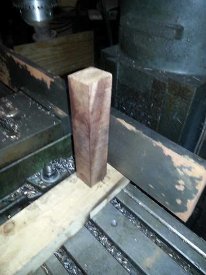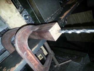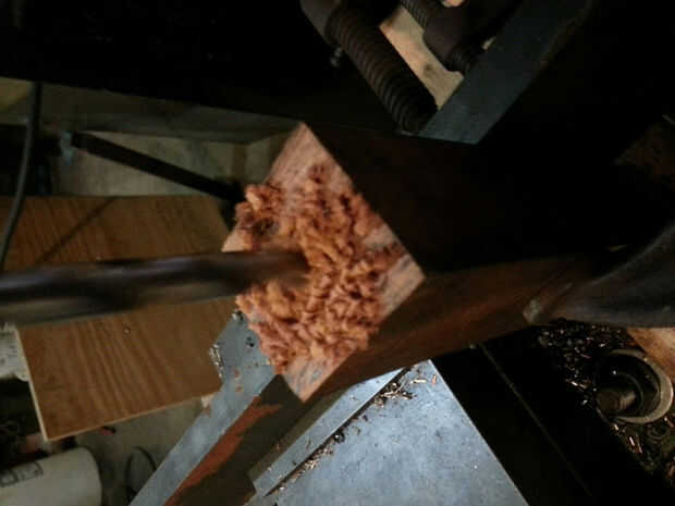 Lo primero fue hacer el agujero. En mi primer intento, he intentado grabar sólo el agujero, que servía para ser bastante desafiante y fracasado. Hice algunas investigaciones en línea y adornadas taladrar un agujero era la manera de ir. I configurar la pieza en la fresadora vertical y perforar un agujero más pequeño y luego el ancho de la espiga. Una prensa del taladro también podría ser utilizado apenas como con eficacia, por la mano requeriría un pedazo más grande de acciones, permitiendo espacio para más error. Empecé con una broca de longitud típica. Después de la broca de tamaño pequeño, usé uno más largo que ahora podría encajar en la máquina, como pude fijar en la madera por el agujero. Después de que uno tenía todo el camino todavía no estaba por la pieza de orificio. Perforé el resto a mano.