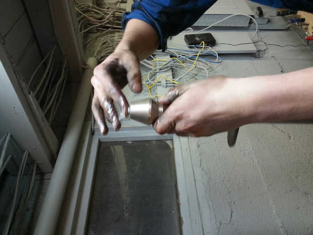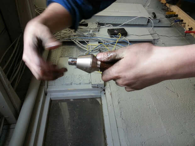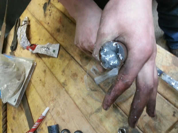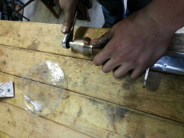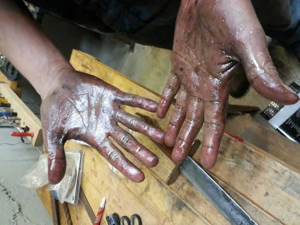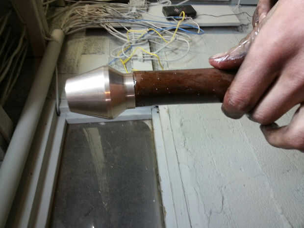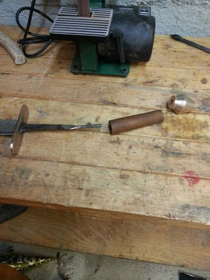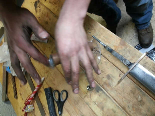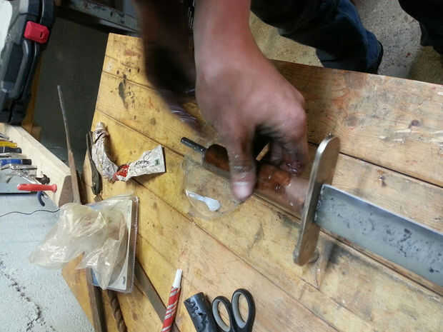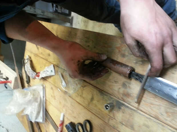 Con todo alineado, mezclado el pegamento. Parte requieren pegamento. Había cubierta todo el tang y vertió en el mango de madera. Había alineado superior e inferior de la manija así. Me deslicé la manija sobre la espiga, así como el pomo. Me resbaló la lavadora en y acodado hacia abajo la tuerca.