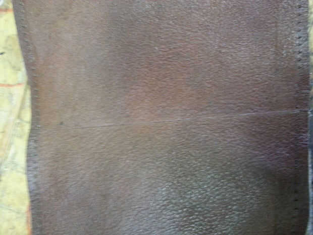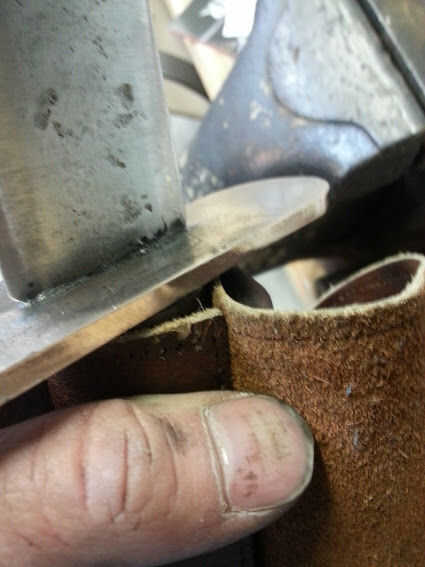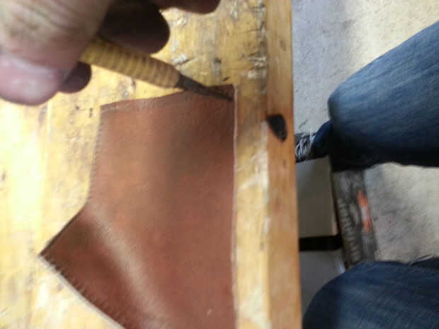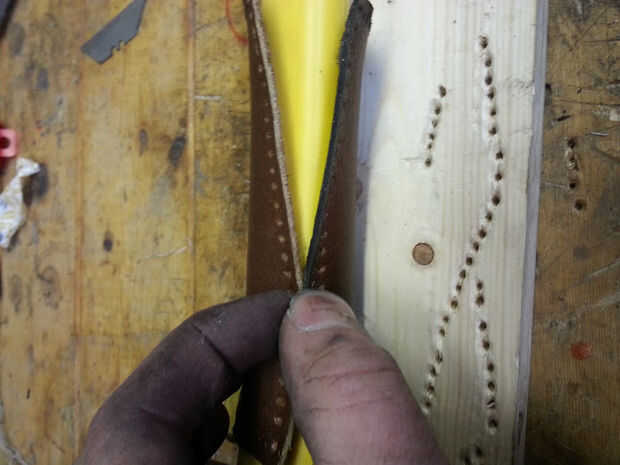 Luego había perforado los agujeros, usando sólo un punzón y un martillo en un pedazo de madera. Así, podría utilizarse un punzón. Otra estrategia típica de cuero grueso es perforar con una broca muy pequeña. Perfora todos los agujeros y estaba listo para coser.