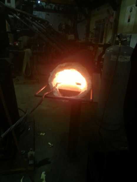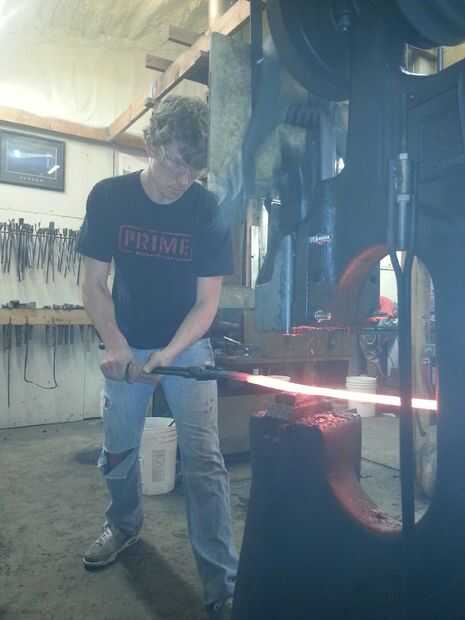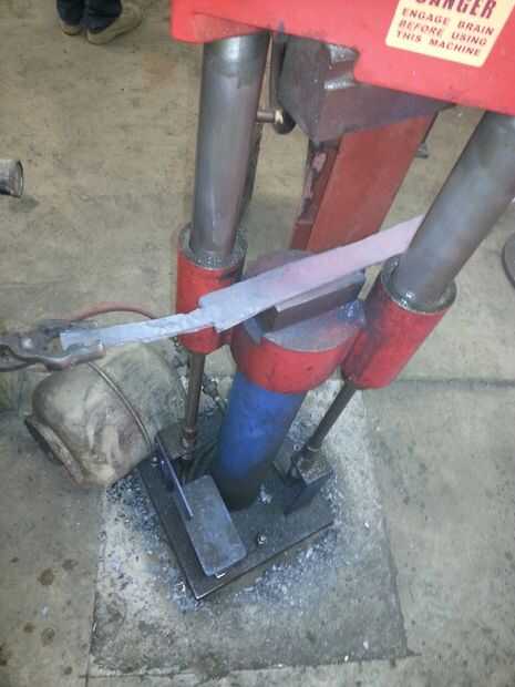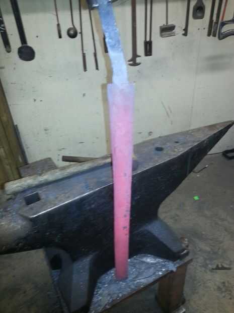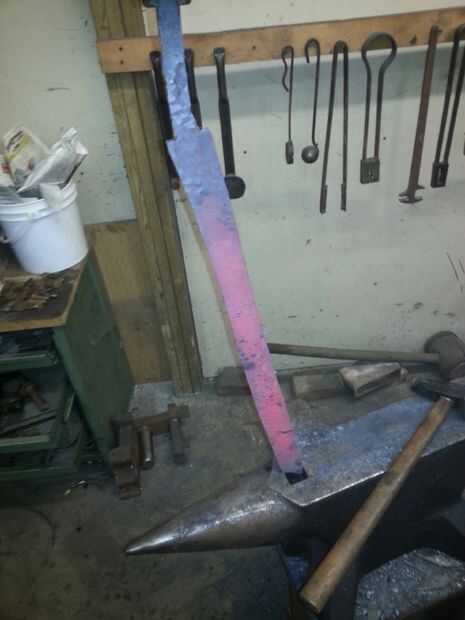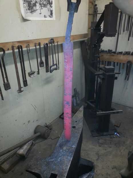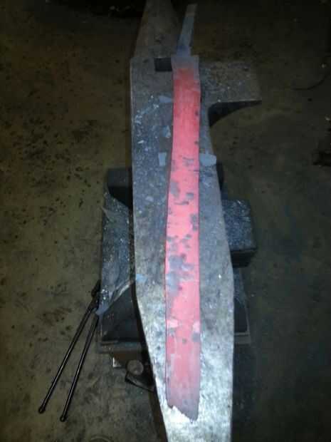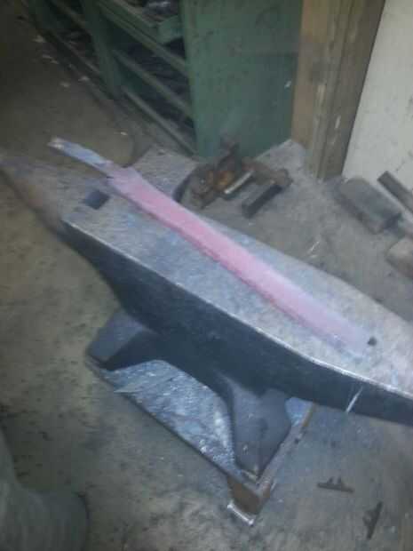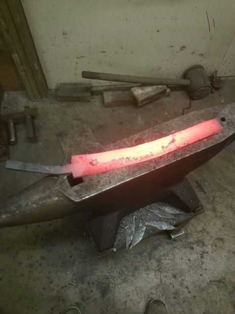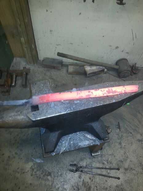 Calienta la sección entera con una forja de gas de cinco quemadores a un calor amarillo. En el martillo con cuidado apliqué golpes constantemente a lo largo de la longitud de la pieza.