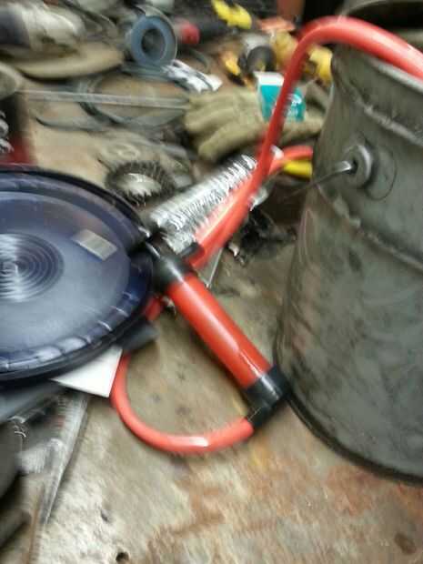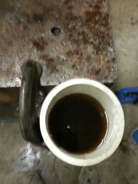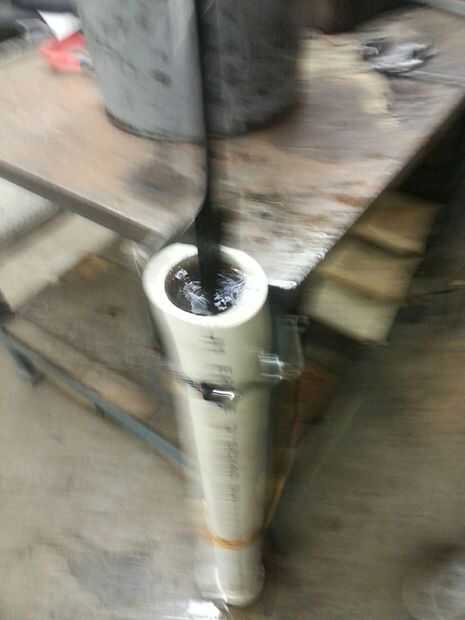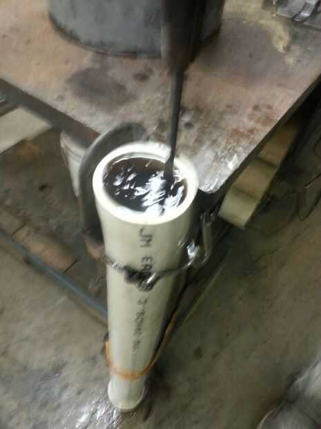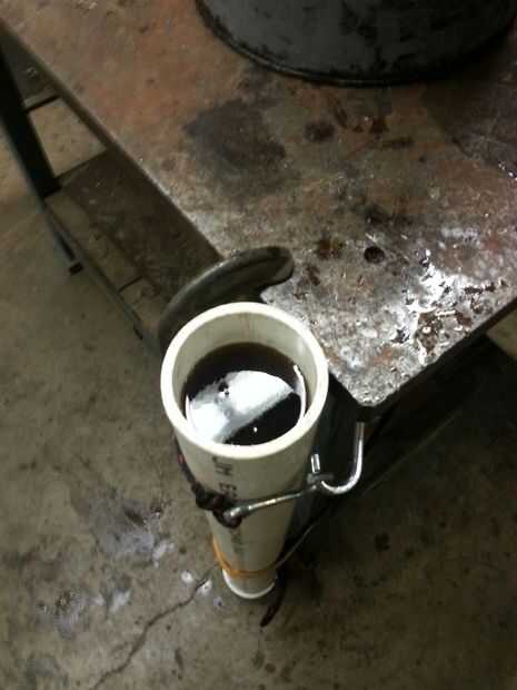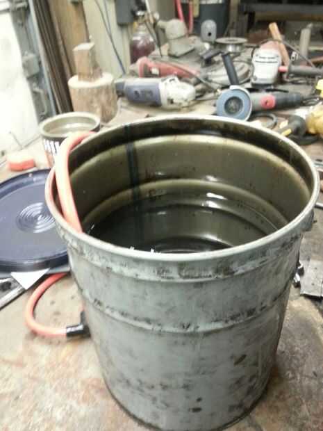 Para contener el aceite, usé un trozo de tubo de PVC de tres pulgadas. Había pegado el tapón y fijados a una mesa estable. Asegúrese de que la sección del tubo es mucho más larga luego la espada. Antes de enfriamiento Asegúrese de que el aceite está caliente. Esto se logra fácilmente calentando un trozo de metal naranja y poniendo en el aceite.