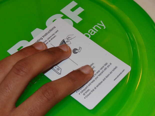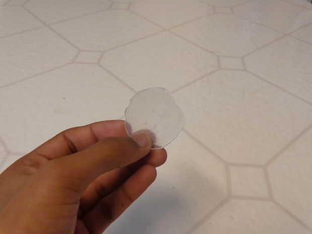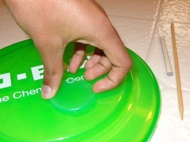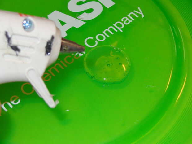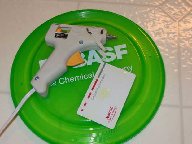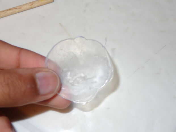 Ahora, Aplique pegamento caliente sobre su superficie más grande de plástico (frisbee en mi caso). Ahora, tome su tarjeta y coloque la cara con jabón en el pegamento caliente para aplanar que hacia fuera sobre 2 mm de espesor. Mantenga durante unos 3 segundos y luego levante la tarjeta. Debe tener una sólida capa de pegamento caliente en la superficie plástica que está trabajando. Una vez que el pegamento haya secado por completo, retire suavemente la capa del pegamento de la superficie. Esta será la capa inferior en la espátula.
