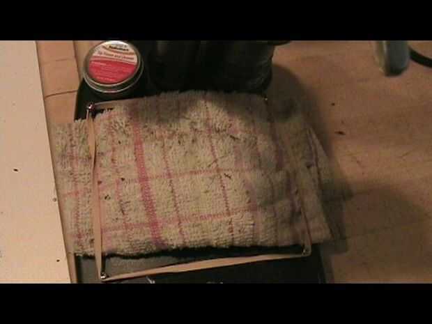 pongo cuatro pequeños tornillos en los agujeros que hice antes. Luego puso el paño entre los tornillos y poner una goma alrededor de los tornillos y por encima de la tela.