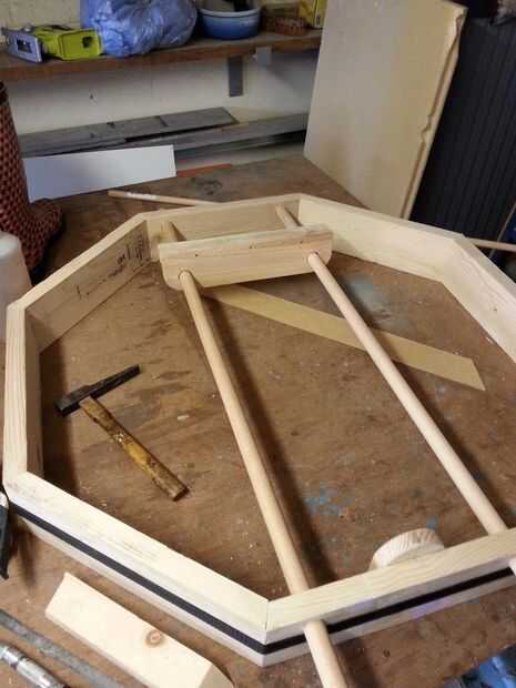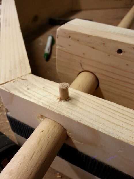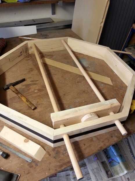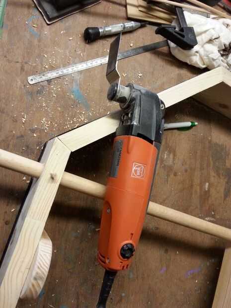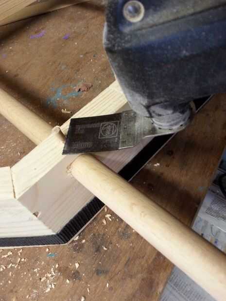 Para fijar las varillas de madera a la estructura octogonal, que perforar la estructura y barra y me hunden en el martillo una barra más pequeña. Luego utilizo mi herramienta multiusos para cortar al ras los pedazos que excedan.