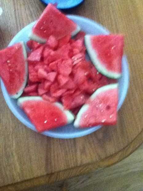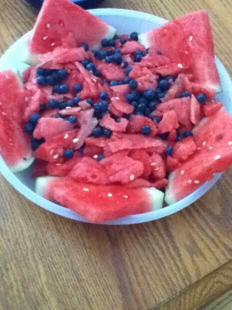Corte pequeños trozos de la izquierda sobre la sandía y coloca en el centro de la estrella entonces puede colocar los arándanos en la parte superior los trozos de sandía y luego mezclar los arándanos y los trozos de sandía y su impresionante estrella!!!!!! Sigue mi me comentario y me gusta!!! ¡ Gracias!