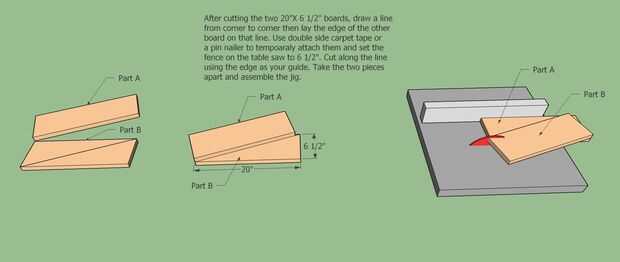 Nota: un buen truco es temporalmente adjuntar los dos 20 "X 6 1/2" y use la tabla como guía para cortar el tablero sobre la mesa de la sierra. (ver dibujo)
