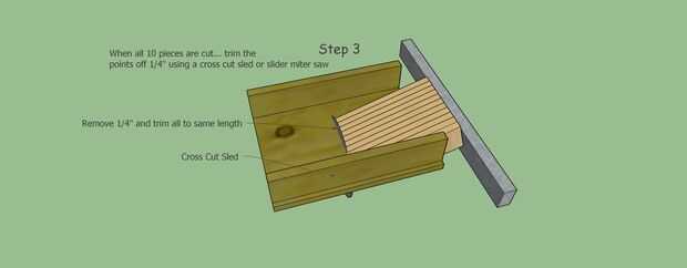 Línea de las piezas como se muestra con todas las piezas contra la tabla cerca de sierra, "cara cortan" hacia abajo y cortar aproximadamente 1/8" a 1/4" de las extremidades usando una tabla VI trineo del crosscut. (como se muestra en el dibujo) Este paso ayuda a garantizar una alineación correcta cuando pegar piezas y elimina los puntos fuertes de la estrella.