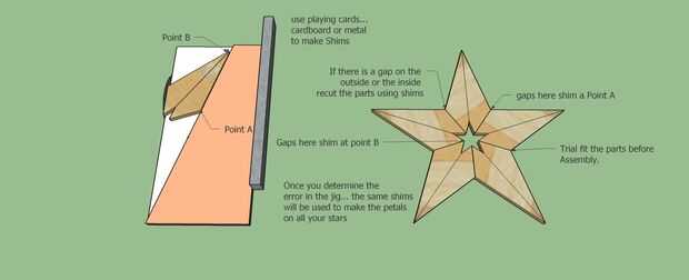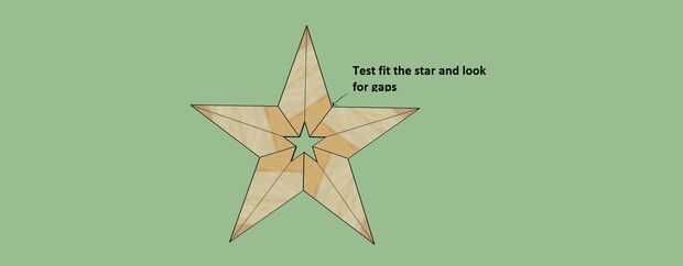 Coloque todas las piezas sobre una superficie plana y prueba que encajen. Es casi seguro que habrá una brecha de algún tipo ya sea hacia el centro o hacia el borde exterior de la estrella donde se encajan las piezas. Todo depende de la precisión con la plantilla se redujo en el primer lugar. Diez piezas con un error de 1/10 grado todavía net un error acumulado de un grado en la pieza acabada.