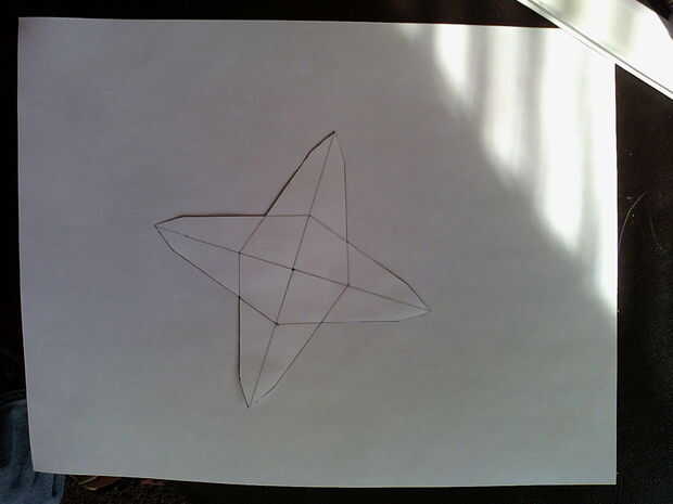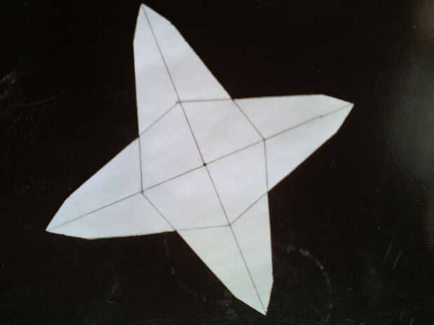 En primer lugar, usted tiene que tomar su papel y dibujar un diseño sobre ella. Puede que necesite un regla, el compás o el transportador para ayudarle hacia fuera, pero todo lo que necesitaba era una regla. Así que básicamente todo lo que tienes que hacer es sacar una serie de triángulos que se cruzan entre sí y hacer tantos puntos como usted quiere. Decidí ir con cuatro puntas estrellas, pero se podía hacer tantos como quisieras. Siguiente haga será probablemente lo mismo que tengo ahora, pero se duplicó. Asegúrese de que los puntos son como incluso como sea posible, porque si no lo están, cuando haces la estrella, será irregular cuando usted intenta y tirarla, y ¿quién quiere un inexacto lanzando estrellas?
