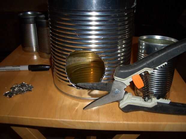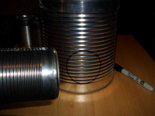 Tomar una de las latas de cuatro sopa (sopa puede #1) y trazar la forma en poder No.10. Corté mi agujero ligeramente sobre la parte inferior de la lata para hacer más fácil evitar ocuparse de la parte inferior de la lata cuando cortar y formar el agujero. Parece haber funcionado bien.