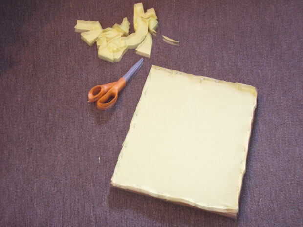 Así que ahora, a cortar la tela sobrante. Asegúrese de no cortar demasiado cerca de las grapas. Voltee el marco ahora y después para comprobar cómo está buscando el frente.
