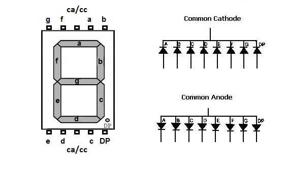 El pin común muestra se utiliza generalmente para identificar que tipo de pantalla de 7 segmentos. Como cada LED tiene dos clavijas de conexión, uno llamado "Ánodo" y otro llamado "Cátodo", por lo tanto hay dos tipos de display de 7 segmento llamado "cátodo común - cc" y "ánodo común - ca" (ver tercera imagen de arriba).