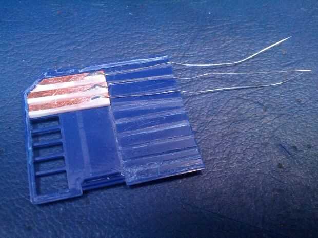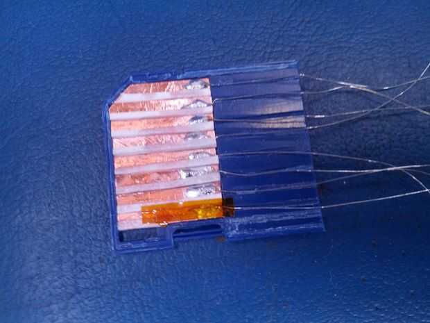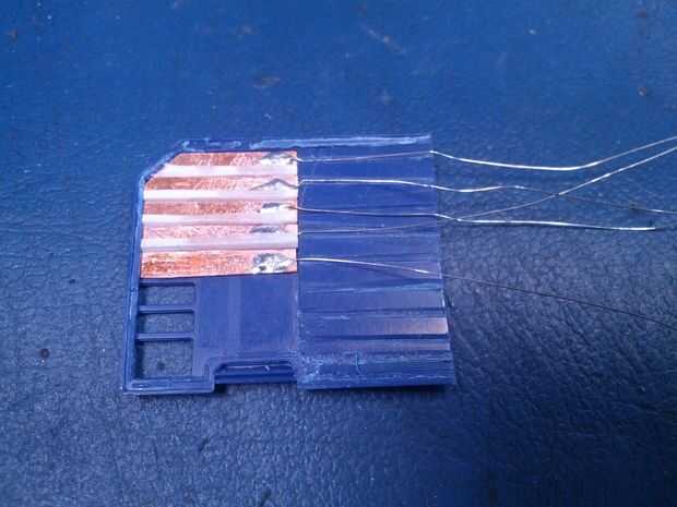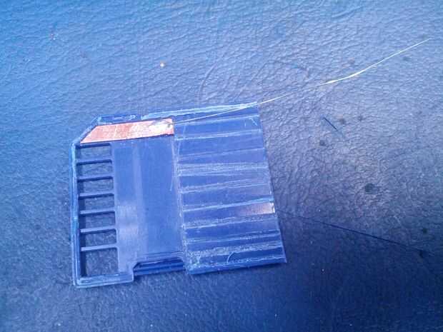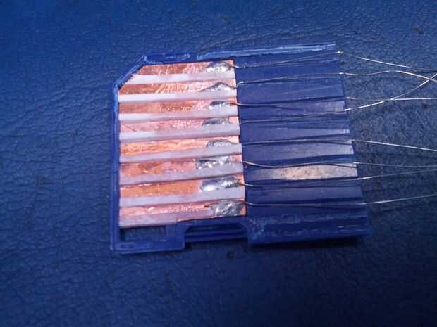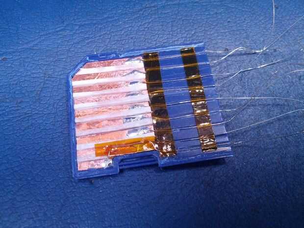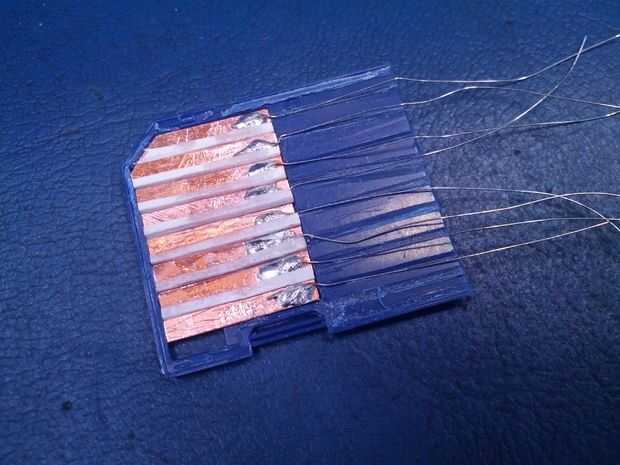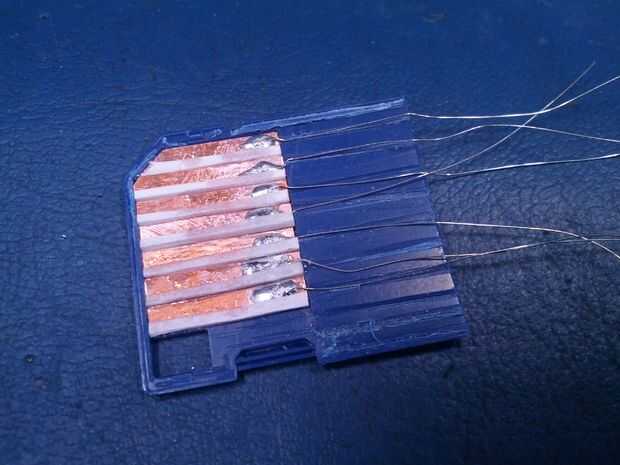 Los contactos se limpien otra vez y luego super pegados a la carcasa de la SD, tenga cuidado de no conseguir el pegamento sobre las superficies de los contactos que se utilizarán para hacer las conexiones eléctricas.