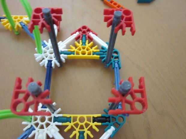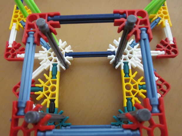 Ahora podemos construir el resto del soporte. Empezar poniendo cuatro de las barras de color marrón en las esquinas de la blanco y verde cuatro conectores de manera, entonces conecte la parte central de los conectores rojo tres vías en la parte superior, después de que conecte cuatro varillas azules como se muestra en las fotos.