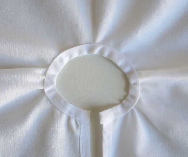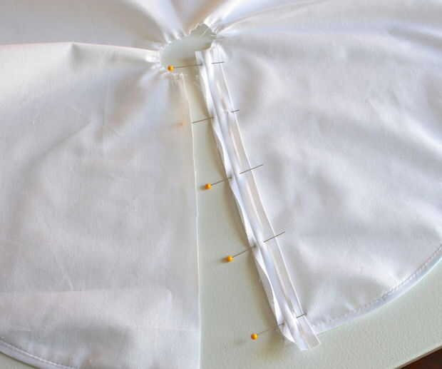 Usted puede coser la cinta alrededor del círculo interno si su árbol de la falda él grande, pero si es pequeño como el mío es mucho más fácil pegar en. Antes de pegar o coser, verifique que su recolecta es agradable e incluso. Al usar el pegamento, no necesita abrir la cinta completamente - sólo despliegan una vez pegamento la mitad a lo largo de la parte superior y voltea la falda y repita del otro lado.