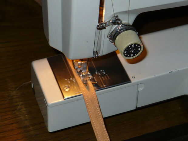 Una vez que se presiona la tira asumen a la máquina de coser y coser cada aleta.