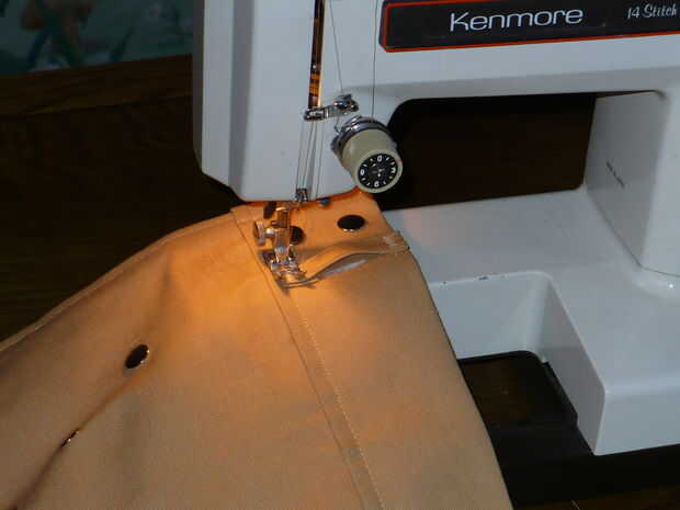 Para unir los lazos de la correa puede plegar los extremos de aproximadamente 1/2 pulgada y coser a la parte superior e inferior de la banda de la cintura. Vas a través de bastantes capas de tela, así que asegúrese de usar una aguja fuerte y tomar lento, mover su máquina a mano si es necesario.