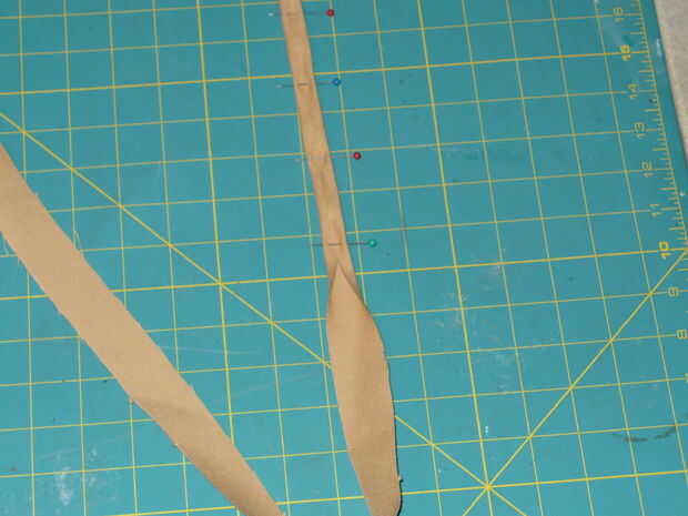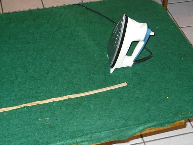 Usted tendrá que doblar el filo al centro de la franja. Prender con alfileres la tira doblada sobre cada 3 pulgadas.