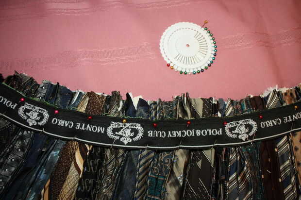 Tomé el elástico y clavado en la parte posterior de la falda de lazo (no he cosido el lado sin embargo, lo que es más fácil poner en el elástico).  En este punto tengo que decir que no sé nada sobre costura de elásticos.  Sólo con alas esto y funcionó para mí.  Si usted quiere hacer esto correctamente, no me pregunta cómo - tal vez ver si usted puede encontrar las instrucciones en línea (quizás alguien puede publicarlo en Instructables).  O usted podría improvisar como lo hice.  Otra opción sería simplemente añadir un cinturón más adelante - de nuevo, ser creativo!