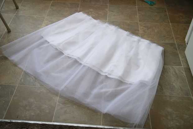 Con una puntada larga, Hilvanar las piezas de tul. Ahora coge los extremos opuestos de la falda (el 33,5" lados) y coser derecho lados juntos. Ahora debe tener un tubo un poco largo de tul. Ahora es el momento para plisado el tul y fijación a la falda de forro. Tardará un rato, porque no sabe exactamente cuánto puede hacer uniformemente alrededor de la falda entera. Empieza fijando y luego arreglar lo que no se ve aún. Mis pliegues eran cerca de 1/2 ancho y un par de pulgadas de distancia. Cuando termines con eso, coser todo el perímetro, a coger todo.